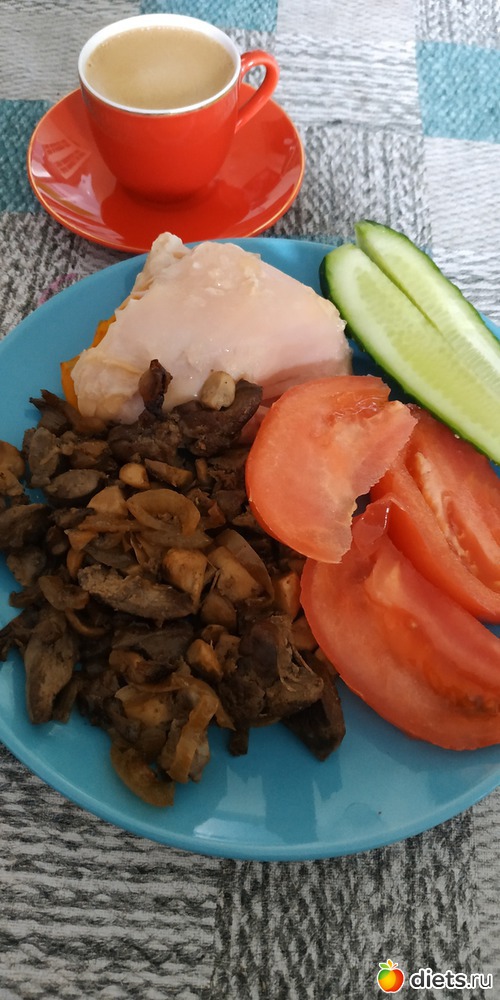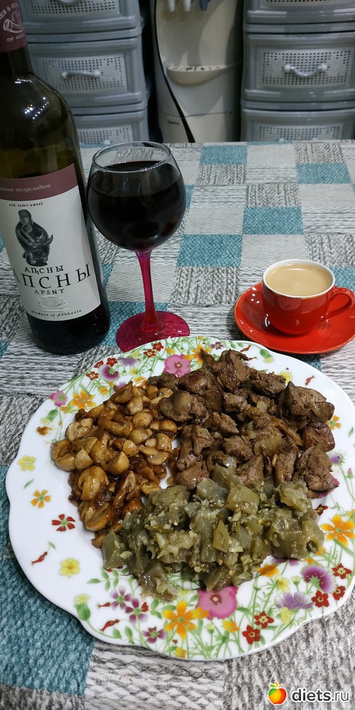 печень жаренная с луком, грибы жаренные с луком, баклажаны как грибы и бокальчик винца