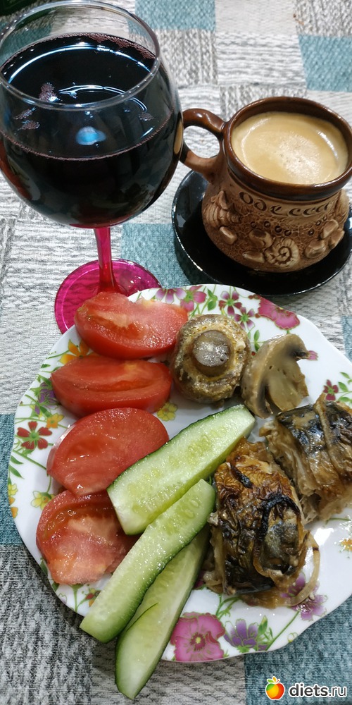 Скумбрия гриль, грибочки маринованные в сметане, гриль. Свежие овощи. Бокальчик винца