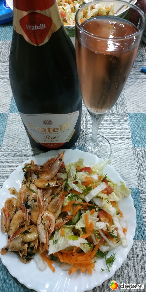 Жаренные криветки с чесноком, салат, и бокальчик шампусика