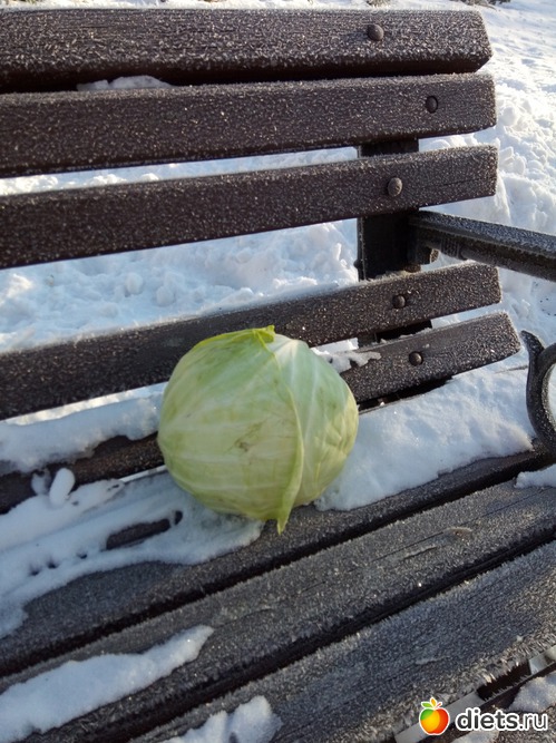 Потеряла я 5кг и 300 г, на прогулку пошла с 3-килограммовой гантелей, с 1-килограммовой гантелькой и кочаном капусты весом 1,5кг. Вот он, на лавочке присел: