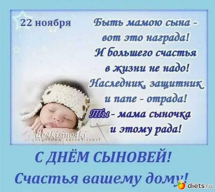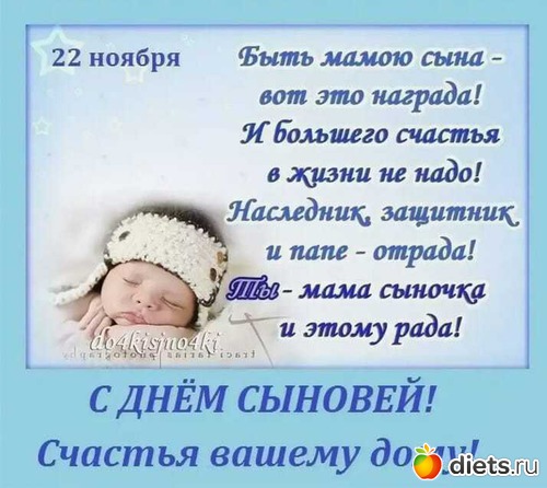 Для России – это последнее воскресенье ноября. День отца, пожалуй, известен несколько меньше, но также празднуется в различных государствах и имеет, как и День матери, свою историю. Продолжая тематику праздников семейного характера, по просторам Интернета всё чаще «бродит» ещё один знаменательный день, сегодняшний праздник – «День сыновей» или «День сына». История этого праздника невелика и не актуализирована средствами массовой информации. Существуют даже некоторые расхождения в том, когда же этот день следует отмечать. В России и в ряде других стран День сыновей празднуется 22 ноября, хотя официальной даты, посвящённой этому празднику пока нет. Кому посвящён этот праздник? Ответить на этот вопрос несложно: День сына могут отмечать все мужчины в качестве сыновей, а также семьи, в которых есть сын. Как таковые, традиции празднования этого Дня ещё не сформировались, и каждый по-своему отмечает или оставляет незамеченной эту дату. Трогательны поздравления матерей своим сыновьям, встречаемые на форумах, представленные часто как молитва за сына. Актуален вдвое этот День для семей, чьи сыновья, исполняя свой гражданский долг перед Отечеством, проходят службу в рядах Вооружённых Сил или кто предпочёл службу в Армии или других силовых структурах иным родам деятельности, выбрав её своей профессией, постоянно рискуя жизнью на благо Родины. Не менее ярки сдержанные эмоции в поздравлениях отцов своим чадам, где выражается гордость за достигнутые сыновьями успехи и надежды на поддержание мужественности на всём дальнейшем жизненном пути ребёнка, каковым он остаётся для родителей, даже становясь мужчиной. С трепетом вспоминаются слова ефрейтора Святкина – героя Леонида Быкова из кинофильма «Аты-баты, шли солдаты...», когда перед своим последним боем он рассказывает товарищам о том, что написал письмо годовалому сынишке: «…я ему написал, чтоб он человеком был, чтоб ему не довелось хлебнуть, то, что мне, чтоб дешёвка из него не вышла...». В этот день не только родители поздравляют сыновей, но и сыновья проявляют по отношению к отцу с матерью внимание. Поскольку праздник семейный, то чаще всего он отмечается в тесном семейном кругу. И хочется верить, что пройдёт год, два, пять, и День сына станет таким же известным и популярным праздником, как День матери и День отца, встав в один ряд с датами, когда родные и близкие дарят друг другу тёплые слова, заботу и Любовь!