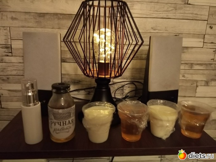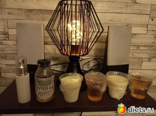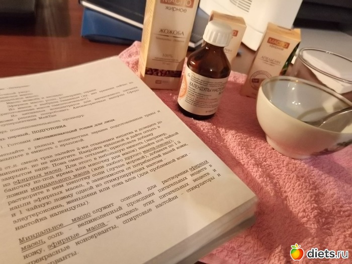 Я не слишком строго следовала рецепту, масло взяла не миндальное, а жожоба, отвар был из ромашки, мелиссы и зеленого чая, вместо женьшеня была настойка календулы. В итоге получилась следующая композиция: