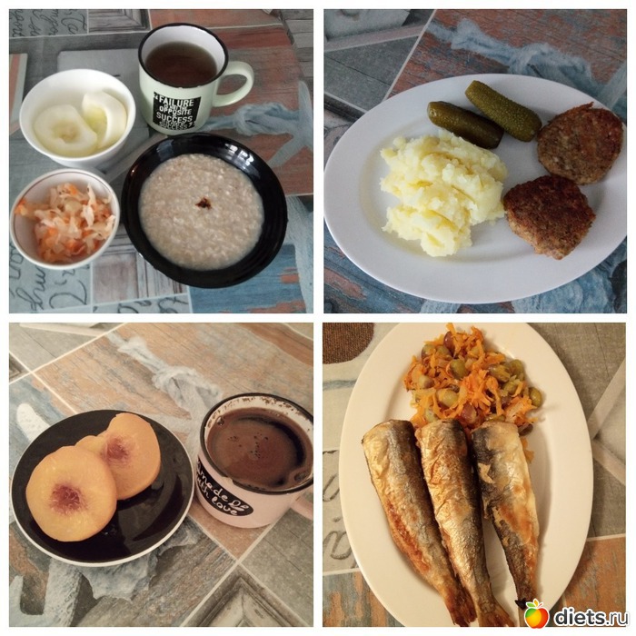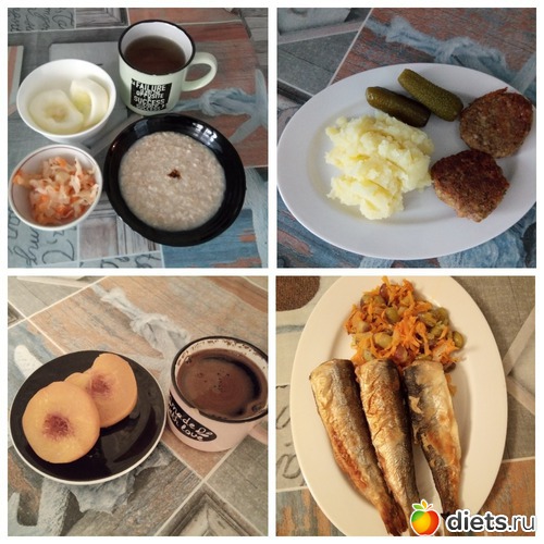 На завтрак мятный чай, овсянка, яблоко и квашеная капуста.