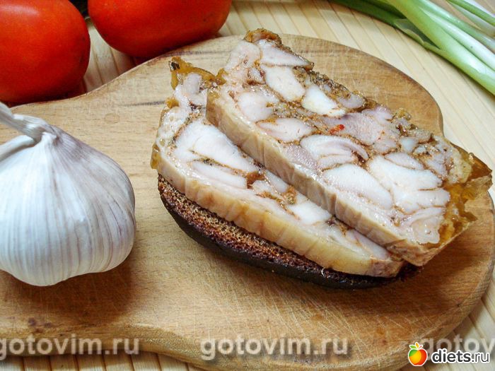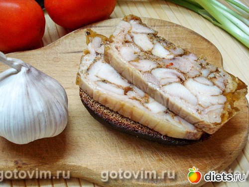 После полного остывания поставить сверху гнет и отправить террин из куриных бедер в холодильник. Через 6-8 часов можно освободить мясо от упаковки и нарезать его. Террин уверенно держит форму и легко нарезается, даже тонкими пластинами. Такое мясо можно использовать и в бутербродах, и на праздничном столе. Приятного аппетита!