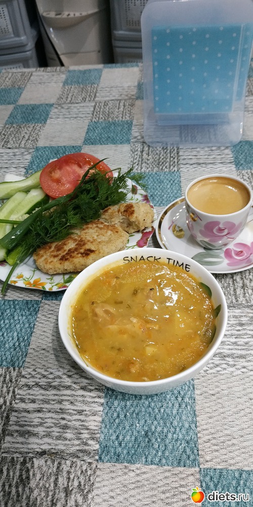Гороховый суп с копченой курицей. котлета курино-кабачковая, свежие овощи и зелень