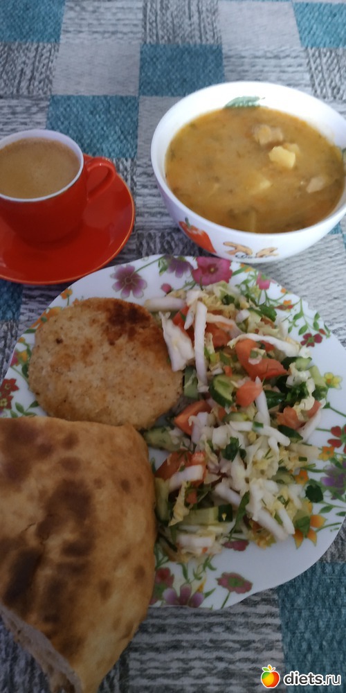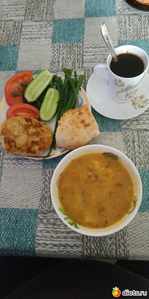 Гороховый суп с копченой курицей, котлетка курино-кабачковая, свежие овощи, кусочек лаваша с тандыра