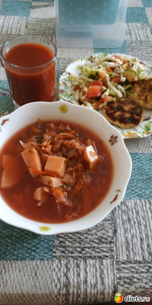 Борщ мясной, куриные котлетки, салат из свежих овощей, томатно-овощной сок