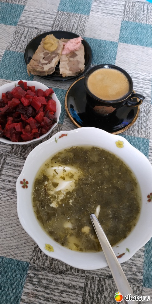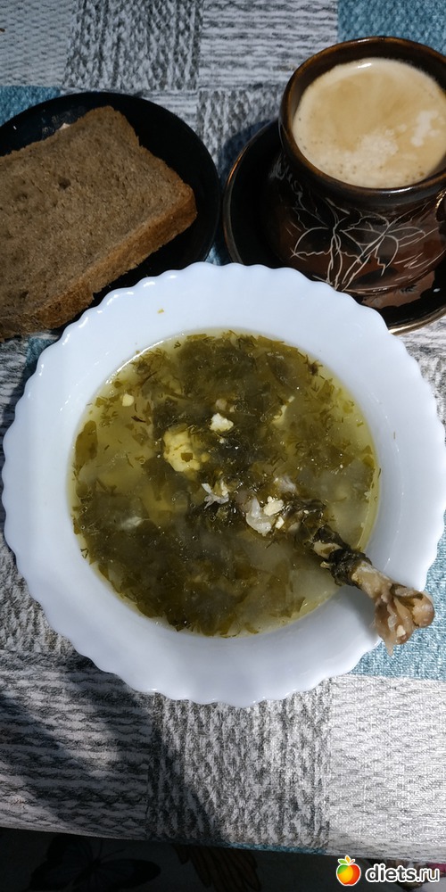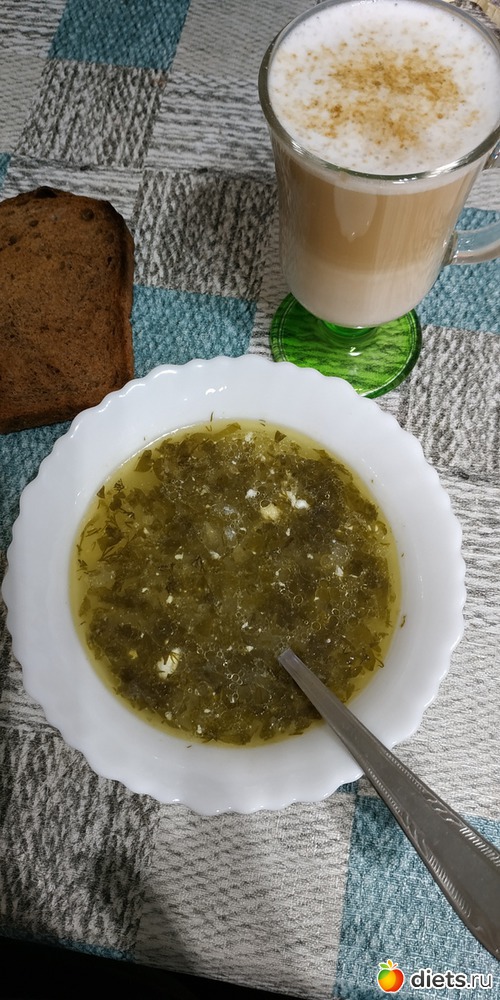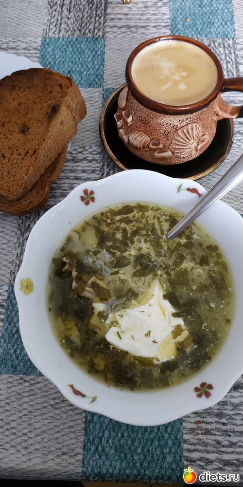 Зеленый борщ, черный хлеб, томатно-сельдереевый сок