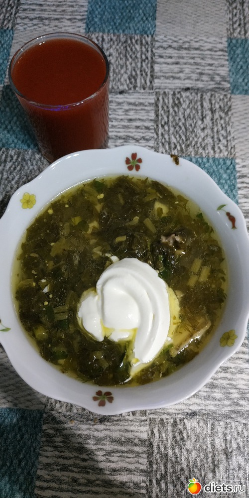 Зеленый борщ со сметаной, томатно-сельдереевый сок