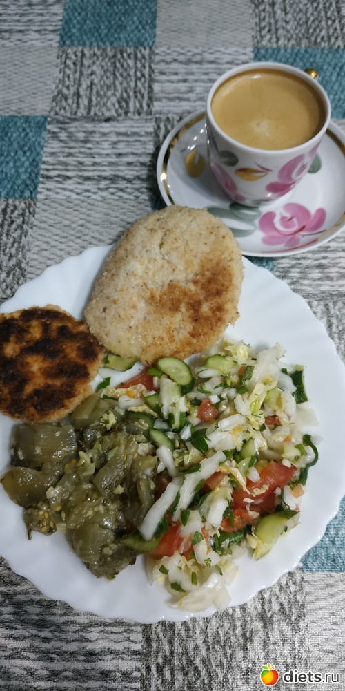 котлета курино-кабачковая и куриная, салат из свежей зелени, баклажаны как грибы