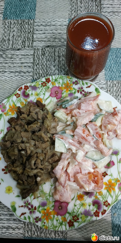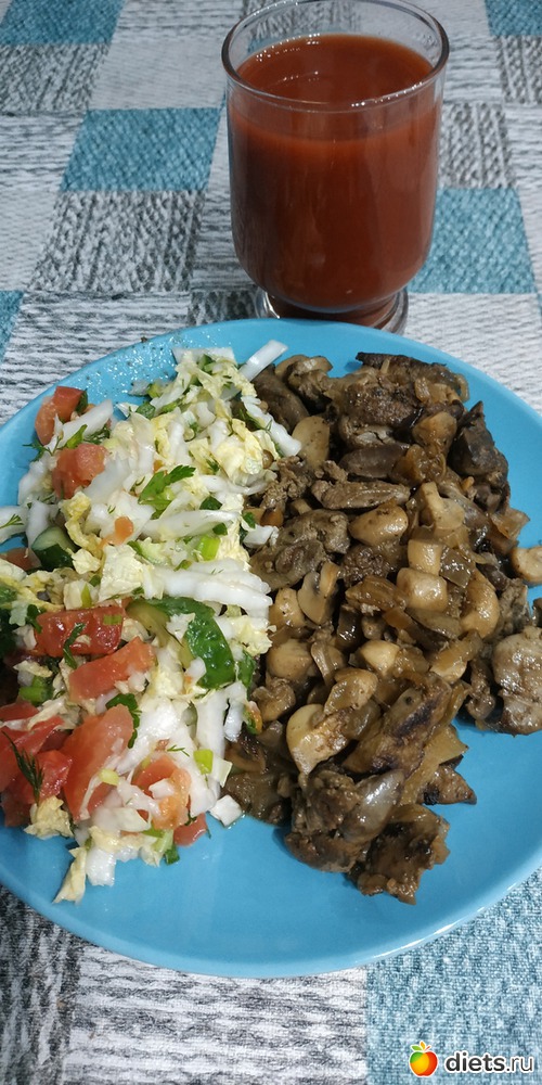 куриная печень и сердечки и грибы жаренные с луком на 1 ст ложке масла, свежие овощи, томатно-овощной сок