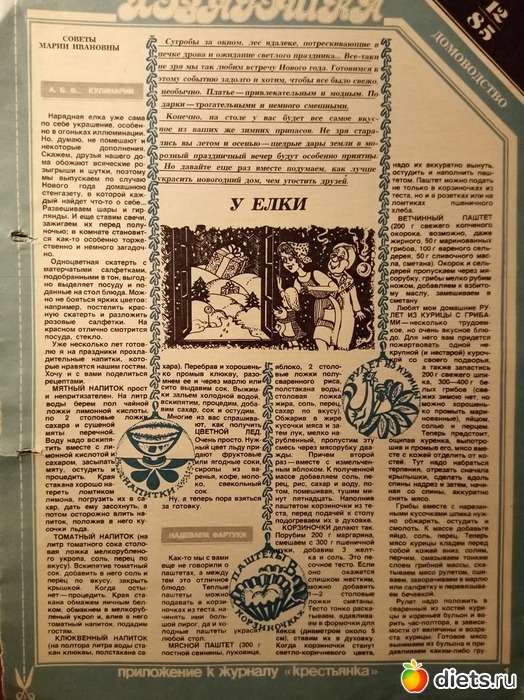 Сегодня я покопалась в закромах письменного стола и достала свою (еще мамину!) подшивку приложений-вкладышей к советскому журналу "Крестьянка". Храню бережно, люблю читать, листать странички. Ностальгия... Решила вам сфотографировать приложение за декабрь 1985 года, итого прошло 33 года.