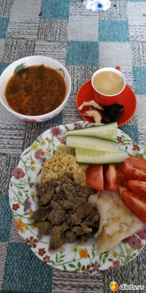 Постный борщ, булгур, куриные желудки, печень со сливками, капуста лепестки, огурцы, помидоры