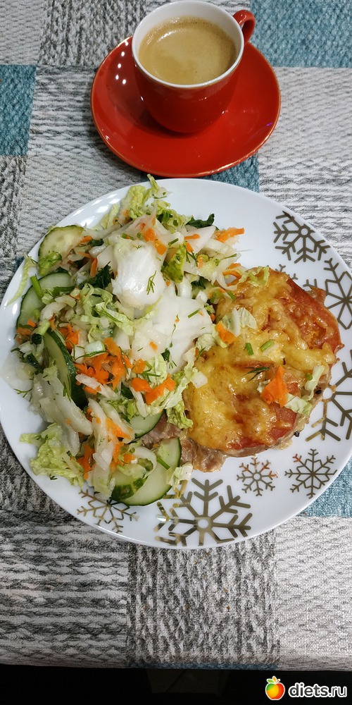 салат из свежих овощей, мясо по французски (свинина, помидор, лук, сыр)