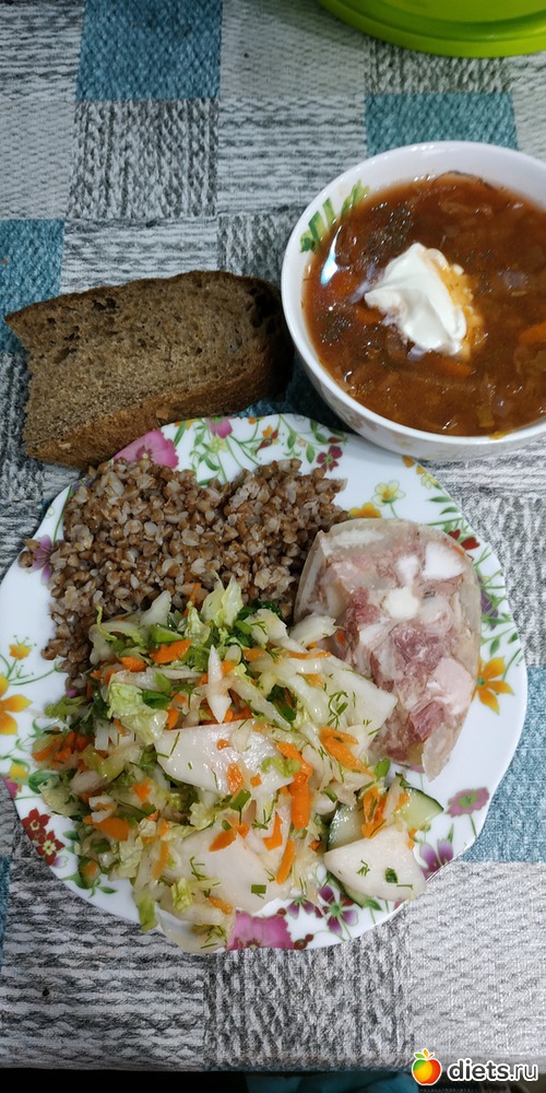 Постный борщ, салат из свежих овощей гречка, ветчина, черный хлеб