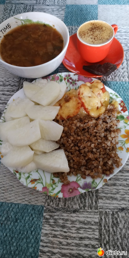 Постный борщ, гречка, мясо по французски, редис дайкон