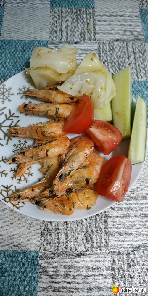 Креветки на гриле, капуста лепестки, помидор, огурец
