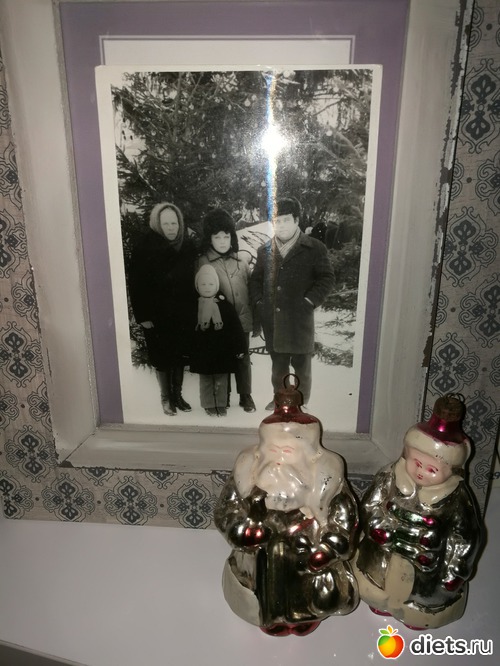 Это-фото нашей семьи, навскидку ему уже лет 40. Деду Морозу и Снегурочке рядом-гораздо больше. Эти игрушки 60 годов, мамины.