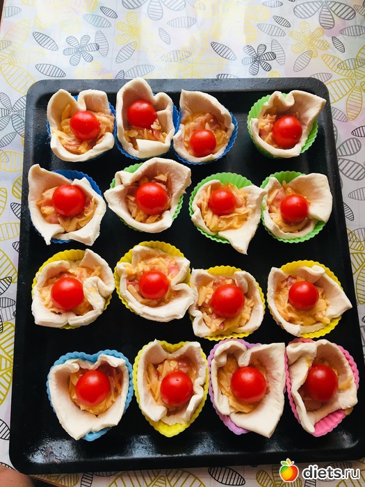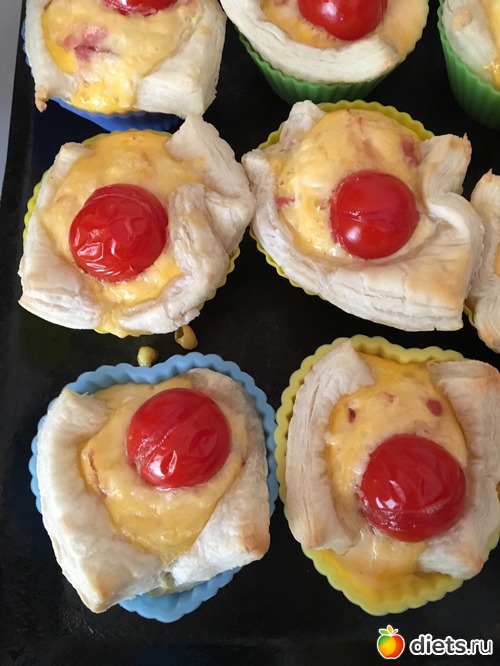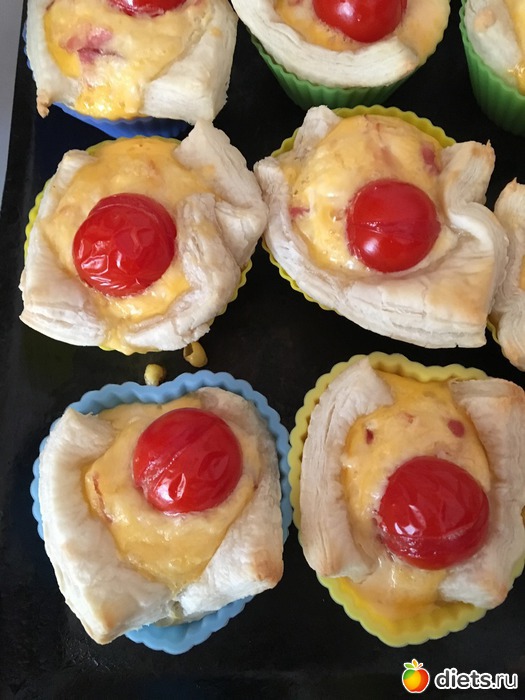 Слоеное тесто разморозить, делим на равные квадраты и выкладываем в формы для выпекания кексов, смазанные сливочным маслом.