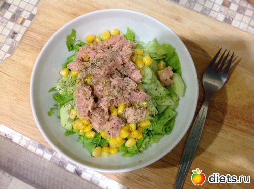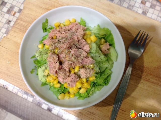 Основа - салатные листья, побольше, там калорийность смешная, потом огурец и консервированная кукуруза. А сверху тунец: я привезла десяток банок из Италии, он там отличный, что в масле, что в собственном соку. Баночка всего 50г, очень удобно. Масло слила, а то, что осталось на тунце, решила считать заправкой. Ну и прованские травы сверху. Все без соли, конечно, в консервах уже была.