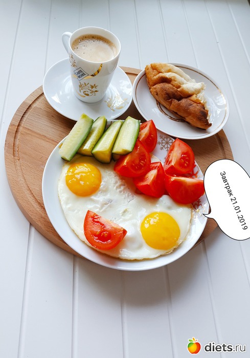 Завтрак - глазунья из 2-х яиц, без масла, я жарю на 1 пшике (масло с распылителем)
