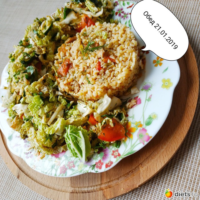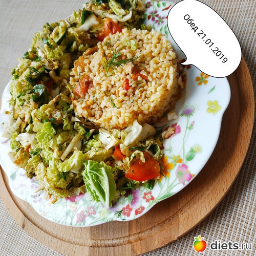 Обед - булгур отварной 150, чахохбили из курицы по грузински 100 г в готовом виде (рецепт смотри от 17.01.20019), салат из свежих овощей 200 гр (из чего салаты читай в посте от 15.01.20019) заправленный бальзамическим уксусом с модены