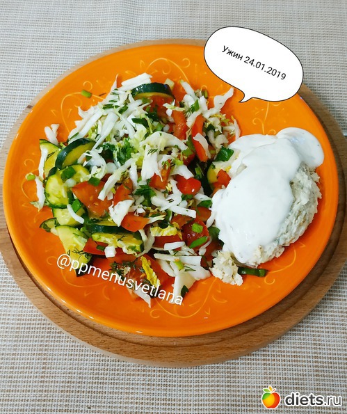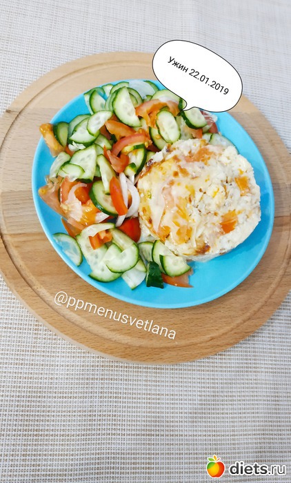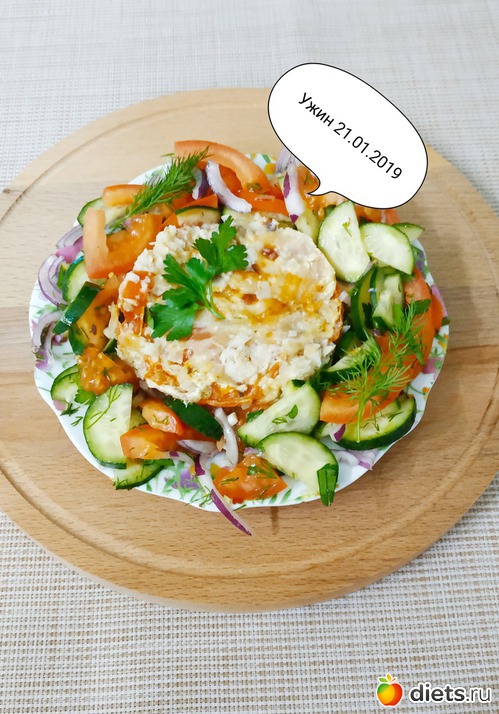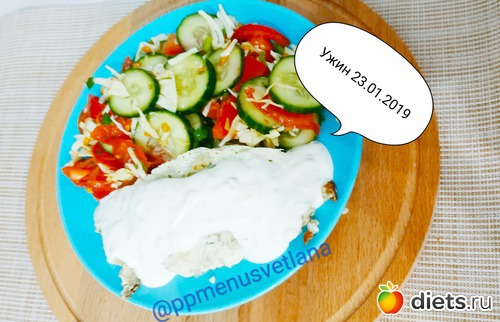 Ужин - треска в овощной шубке запечённая под сырной корочкой 150 гр в готовом виде, салат из свежих овощей 250 (из чего салаты читай в посте от 15.01.20019) заправленный 1 чайной ложкой растительного масла