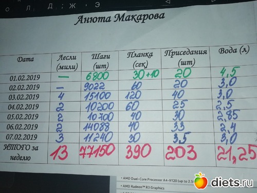 По 3 неделе: задания марафона, в целом, выполнила, правда, не полностью. С Лесли прошла 7 миль. Питание соблюдала, срывов не было, но коридор повысила, ела на 1800-1900, потому что повысила активность, пошла в зал на силовые). Воду стараюсь пить. После 19-30 продолжаю не есть. Из запланированных 1,5 кг сбросила 1,1кг. Но я довольна, конечно. В общем, уже прилично так получилось сбросить.
