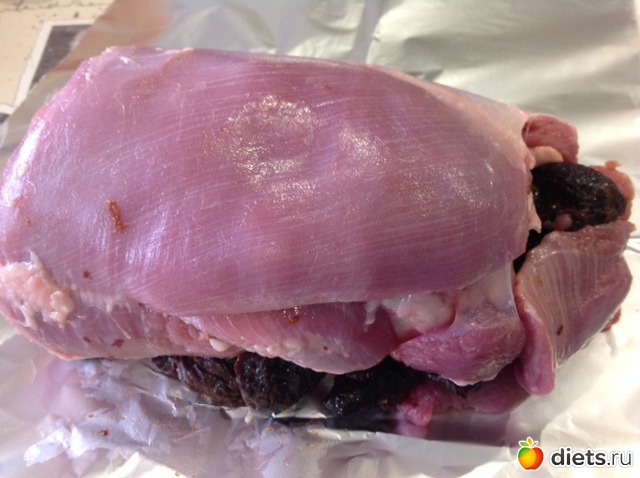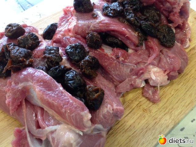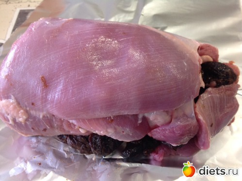 Бедро "развернула"; по максимуму, самые толстые части надрезала и начинила "кармашки" черносливом. Остальной чернослив выложила сверху.