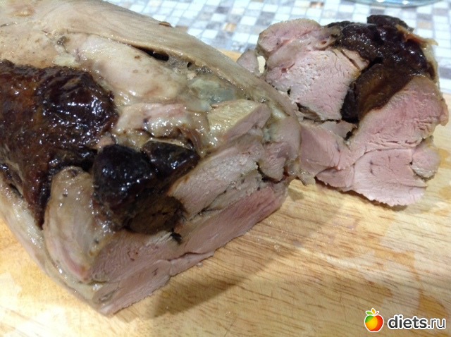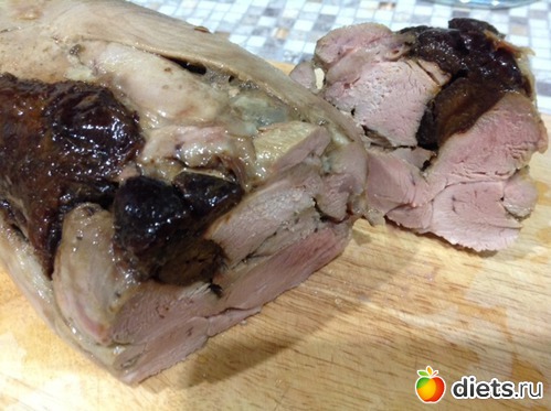И вот результат: форму держит и очень вкусный, намного богаче вкус, чем у грудки. В следующий раз чернослив измельчу в пасту и намажу - так он не будет "выползать".