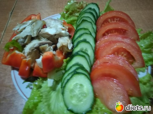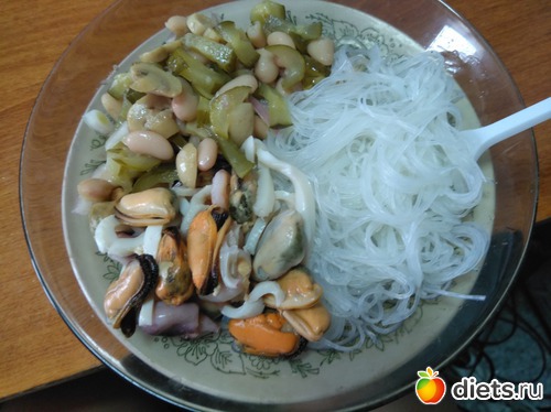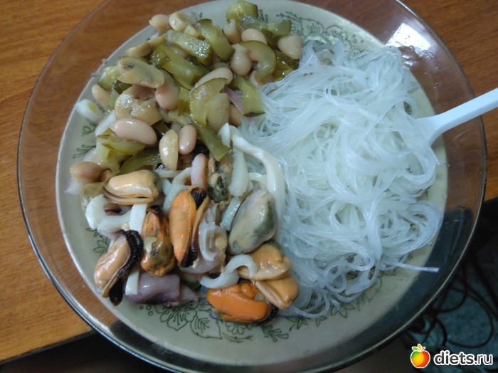 Обедала фунчозой, с морским коктейлем и салатом из фасоли, маринованных: огурцов, шампиньнов, лука-репки,