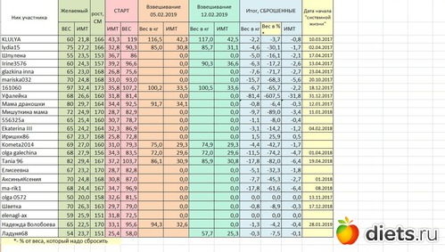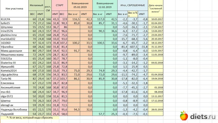 Таблица веса участников группы 12.02.2019