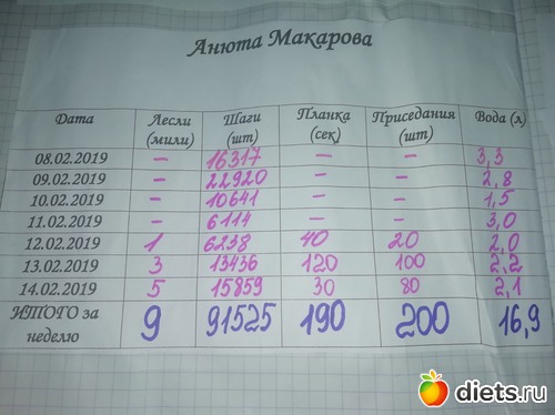 1. Протопала 73000 шагов включая 11 миль с Лесли. Посетила 3 тренеровки, делаю вакуум, планку и прыгаю на скакалке.
