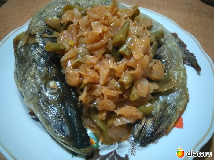 запеченая щука и тушеная капуста со стручковой фасолью.