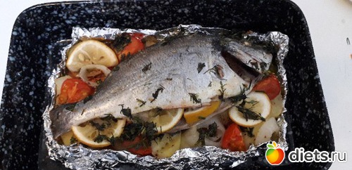 За 10 мин до готовности фольгу снимаем, намазку отгребаем на овощи, снова ставим в духовку, чтобы рыбка была с подсушенной корочкой