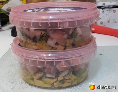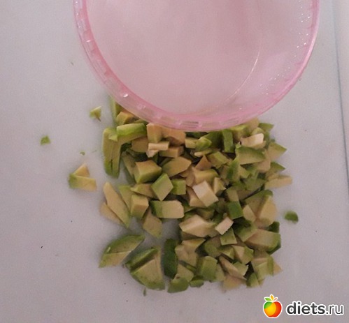 Режем кубиками авокадо, укладываем первый слой либо в сервировочное кольцо, если на тарелку, либо в какую-нибудь баночку.