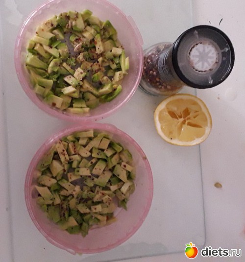Брызгаем на авокадо лимонный сок из половинки лимона и посыпаем перцем из мельнички