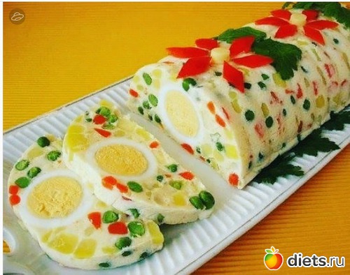 Сперва может показаться, что это какой-то десерт из желе. Но на самом деле это салат, только поданный в виде рулета, да еще и залитый желе, чтобы он держал форму. Получается очень оригинальное и вкусное блюдо для праздничного стола.