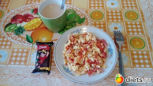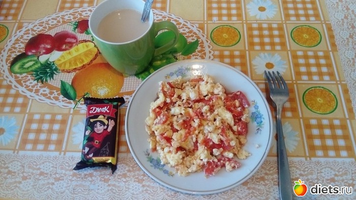 По питанию: на завтрак был омлет с помидоркой, кофе и конфетка.