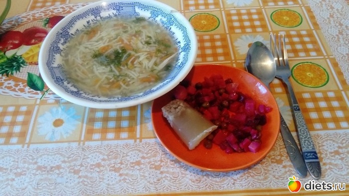 На обед перед прогулкой кушали куриный супчик, салат и немного холодца (холодец свекровь привезла, вкуснятина)