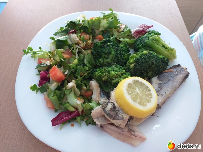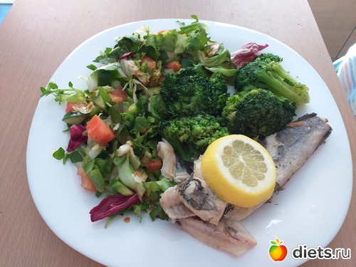 Обед: хек запечённый с брокколи, салат из свежих овощей