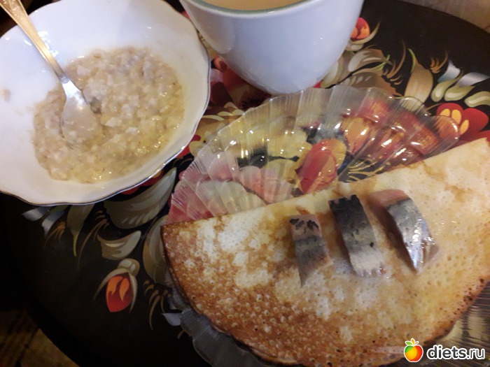 -КАША ГЕРКУЛЕСОВАЯ НА ВОДЕ, С КУНЖУТОМ. БЛИНЧИК. СЕЛЕДКА. КОФЕМОЛОКО