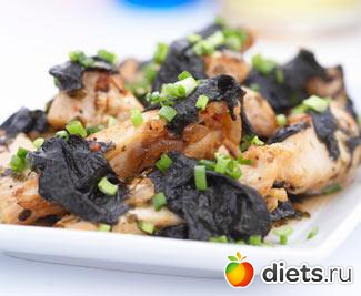 Репчатый лук нашинковать. Отварить куриное филе и нарезать небольшими кусочками. На сильно разогретую сковороду с небольшим количеством жира положить репчатый лук, обжарить его, затем добавить измельченную вареную морскую капусту, кусочки курицы, влить 1/2 стакана бульона, в котором варилась курица, и дать прокипеть. Посолить, добавить растопленное свиное сало.