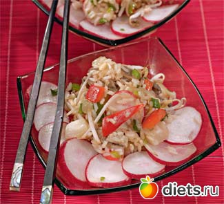 Рис слить, промыть в теплой воде, положить в миску. Добавить грибы, ананас, сладкий перец, зеленый лук, орехи и ростки бобов. Выложить салат на сервировочные тарелки, по краям украсить кружками редиса. Полить заправкой и подать к столу.