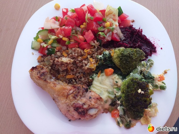 Обед: куриная голень гриль, гречка, салат из свежих овощей, свекла с чесноком, овощная запеканка