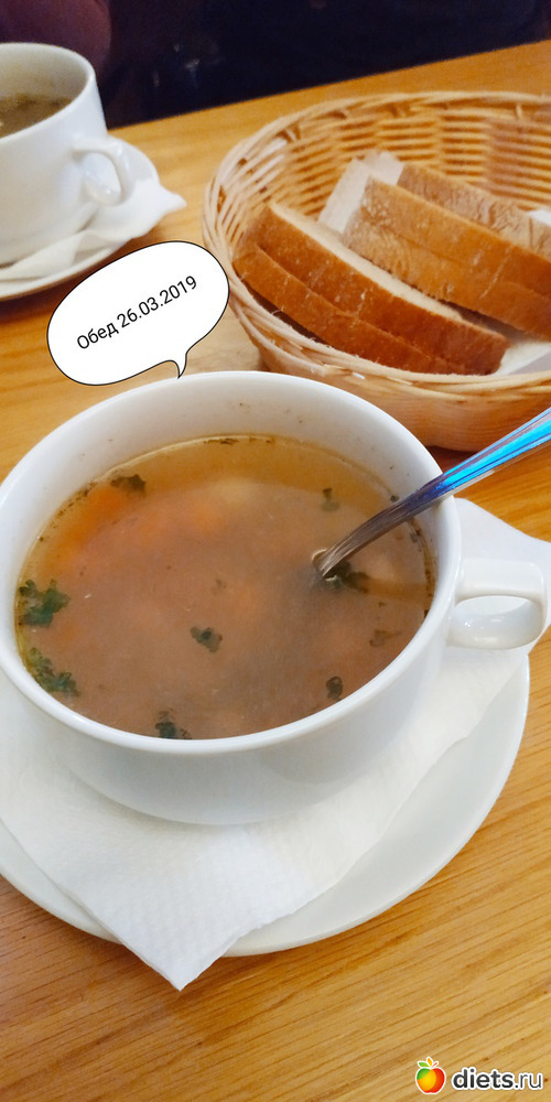 Суп с перловкой, порции второго картофельное пюре и окорочок. Брали два обеда на троих. 1кусочек серого хлеба.