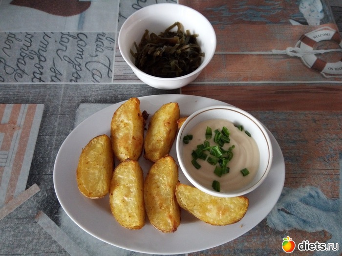 На завтрак тешила себя картошкой по-деревенски в духовке, морской капустой и горохового майонеза не забыла положить: