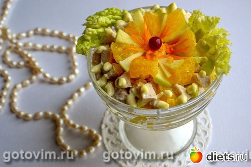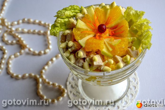 Вкусный, сытный и полезный салат с курицей, апельсином и яблоком хорошо подходит для разгрузочных дней. Салат утоляет голод без переедания. Этот рецепт вполне подходит для тех, кто хочет быть всегда в отличной форме. Если украсить фитнесс-салат, как предложено ниже, то получится праздничный вариант лёгкого романтического ужина. Продукты в рецепте рассчитаны на 1 порцию.