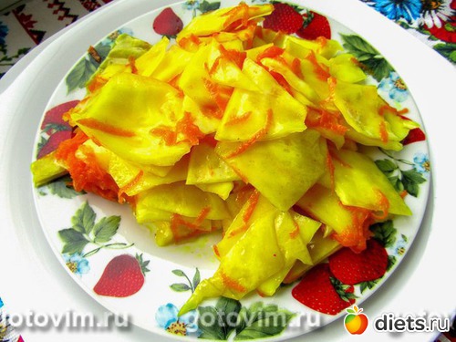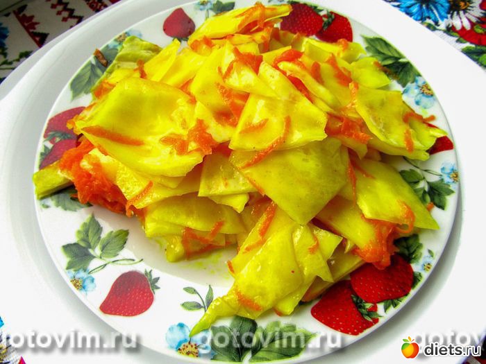 Рецепт хрустящей маринованной капусты, которая будет яркого желтого цвета. В качестве натурального красителя используем одну чайную ложку молотой куркумы. Ее добавляют в маринад. Маринованная капуста будет готова уже через сутки.