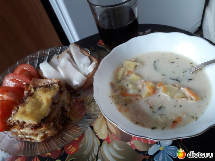 -СУП РЫБНЫЙ, ЛЕНИВАЯ ЛАЗАНЬЯ, БУТЕРБРОД С САЛОМ, ПОМИДОР,1/2 СТАКАНА ПЕПСИ-КОЛЫ(вот захотелось...)